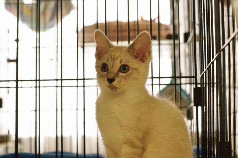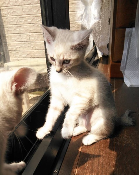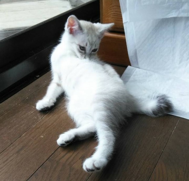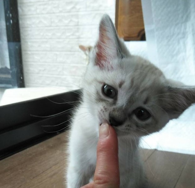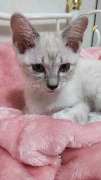 | 特徴(性格など) | 2020.4.5生まれ(推定) 毛色:白・グレー ラグドールなど洋猫さんの血が混ざっていそうな毛色です。 しっぽの先が少し曲がっていて毛がフワフワしていてかわいいです。 姉妹の中では小柄で少食ですが元気いっぱいで家中を走り回ります。 小さいネズミのおもちゃを転がしたりくわえて遊ぶのが大好きです。 夜はハンモックで寝る事が多いですが、昼間はみんなと離れて1人で寝ている事もあります。 |