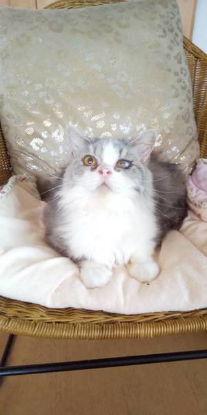 | 特徴(性格など) | スコティッシュフォールド(ロング) 色:ブルータビーホワイト 名前は、ジョージくん ワクチン 接種済み レボリューション 済み 去勢手術 済み 人懐っこく大人しいです。 左目は、子猫の時に風邪をこじらせて、濁りが残りましたが、視野は問題ありません。 鼻が低いので、涙腺が押され涙が出ますので、まめにコットンを湿らせて拭いてあげてください。 男前になります。 |