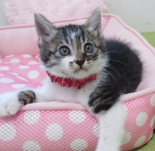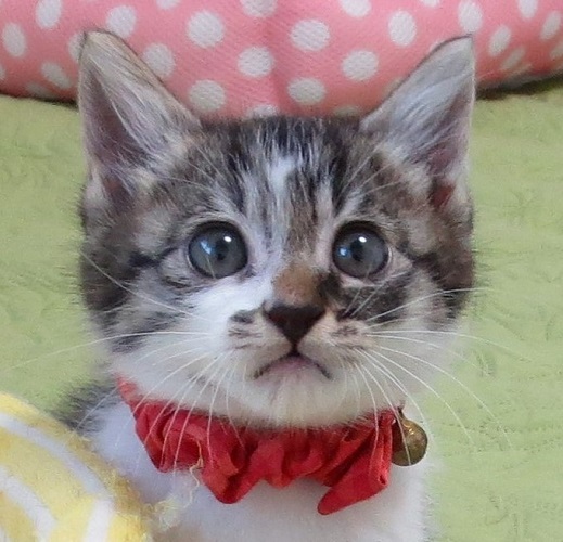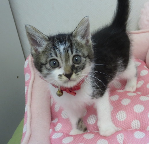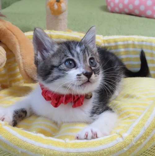 | 特徴(性格など) | 小さいので、生まれ持った性格は判りませんが、良い子です! 保護した当時は当然怒ったりビビったりでしたが、すぐに慣れて、元気いっぱい食べたり主張したりでやっています(笑) 今のところ何の問題もなく、大変伸び伸び可愛いです。 何十倍もの大きさの大人ネコに遭遇すると毛を膨らませ、鏡に映った自分の姿にも毛を膨らませ~ これからは、飼い主さまの元で可愛がられ、性格を作っていくのだと思います。 |