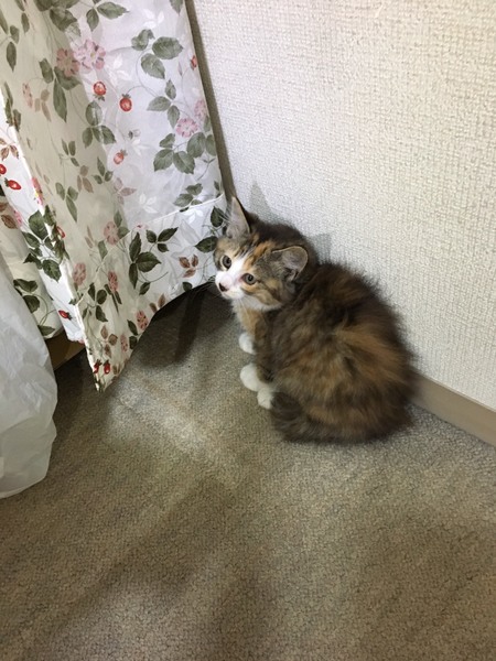 | 特徴(性格など) | 長毛種でとてもかわいい、ミケサビです。少し臆病で、シャーといいますが、抱っこするとおとなしくいい子です。どんどん人に慣れていくと思います。 先住猫さんがおとなしい猫さんなら仲良くなれるのも早いと思います。 まだ1Kgありません、毛がふわふわなだけで小さいです。 |