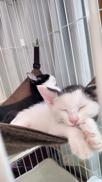 | 特徴(性格など) | ハチワレ男の子は、活発的人懐っこくすぐゴロゴロ言います。子供先住猫とも仲良くできます。 おカッパ女の子は、マイペース、さりげなく隣に寄り添ってくれて優しい子、子供先住猫とも仲良くできます。猫エイズ白血病どちらとも陰性で元気いっぱいです。 |