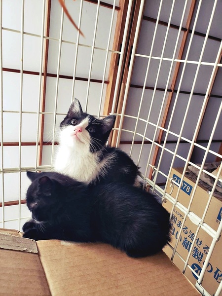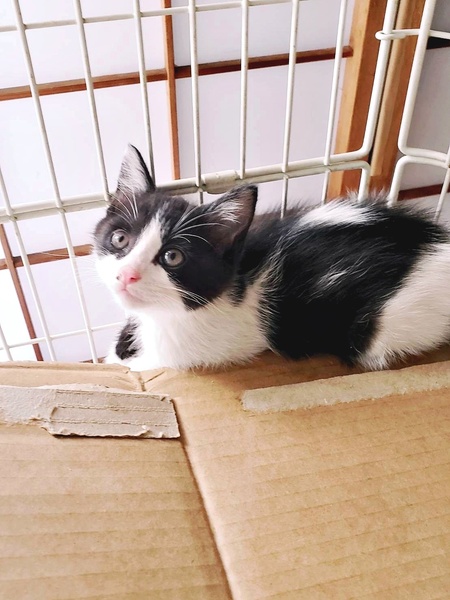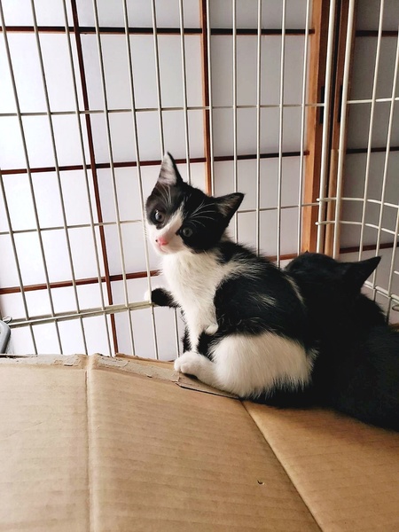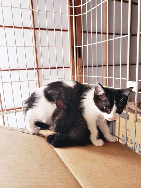 | 特徴(性格など) | 【仮名】オト 【性格】 白黒ハチワレ 人馴れ特訓中です。 兄妹の中で一番小さく、ずっとお母さん猫と一緒にいました。 他の兄妹より馴れるのが遅いですが、日々人馴れ具合が変わってきています。 まだ子猫なので、なるべくお留守番の時間が少ないご家庭が希望です。 生まれてから片時も離れたことがないので 兄弟姉妹アーサー、シオンやほかの子猫など2匹一緒に家族にしていただけたら…と思っています。 |