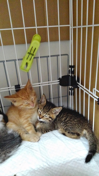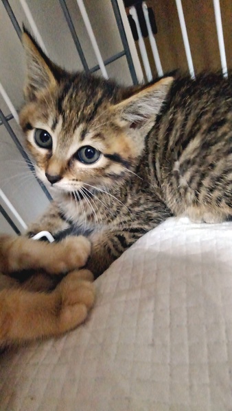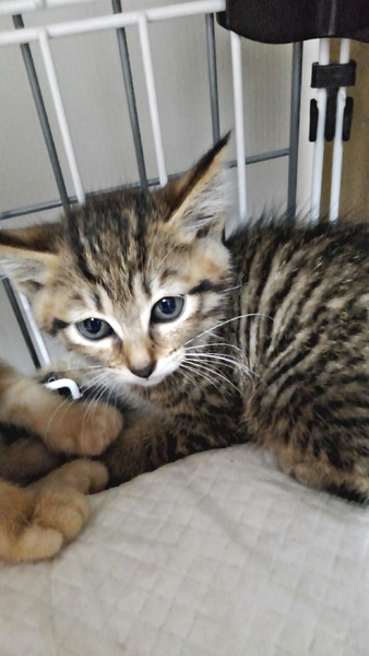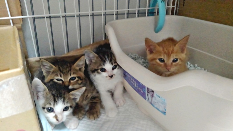 | 特徴(性格など) | 【仮名】かりん 【性格】 キジトラ 人馴れ特訓中です。 だいぶ慣れてきて、兄弟で遊んでいます。 食欲旺盛です。 まだ子猫なので、なるべくお留守番の時間が少ないご家庭が希望です。 生まれてから片時も離れたことがないので 兄弟姉妹あさり、しじみ、あまぐりやほかの子猫など2匹一緒に家族にしていただけたら…と思っています。 |