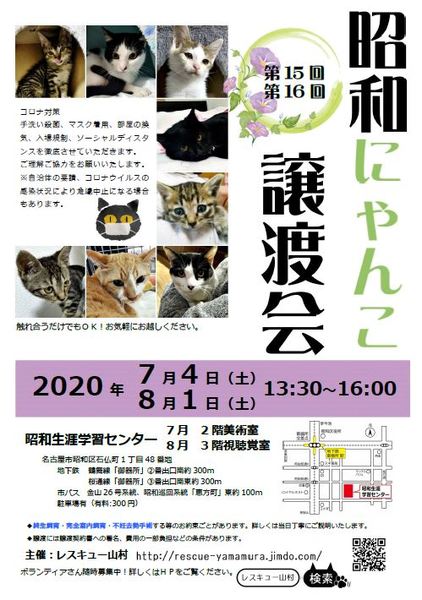 | その他(譲渡条件など) | 猫の飼育が初めての方も大歓迎です♪ トライアルで必要な用品のアドバイスから飼育サポートまでしっかり対応させて頂きます。 お見合い(譲渡会) →後日、ご自宅にお届けしてトライアル →正式譲渡 となります。 ●愛知県にお住まいでペット飼育可能住宅 ●完全室内飼い ●必要な予防処置、医療処置、不妊去勢を行うこと ●お問い合わせの際にアンケートをお願いいたします ●住居が変更になる場合(離婚含む)も終生愛育を約束くださる方 ●トライアルのお届けにご自宅へお伺いすることを了承していただける方 ●ご家族皆さんが里親になることを賛成なこと ●譲渡後の様子を定期的に教えてくださる方 ●譲渡が決まった時 契約書にサインと捺印をしてくださる方 ●高齢者(65歳以上)、単身者、同棲中のカップルの方はお断りする場合があります。 ●健康によい餌をかんがえてくださる方 いろいろお聞きすることになりますが、命のやり取りのためご理解をお願いいたします。 ◆仔猫ご希望の里親様◆ 仔猫は下痢等により数時間対応ができなかっただけでも死に至る事があります。 よって子猫はお留守番のない又は少ないご家庭への譲渡に限らせて頂いております。 ◆譲渡会のお知らせ◆ 2ヶ月に1~2回の頻度で譲渡会を開催しています。 レスキュー山村では譲渡会でのお見合いがメインとなります。 ペットではなく、共に暮す家族の一員としてお迎えくださるお家を希望しておりますので お世話してくださるご家族の皆さん、またはご夫婦ご一緒に会いにいらしてください。 詳しくは、レスキュー山村のホームページをご覧ください。 https://rescue-yamamura.jimdo.com/ |
