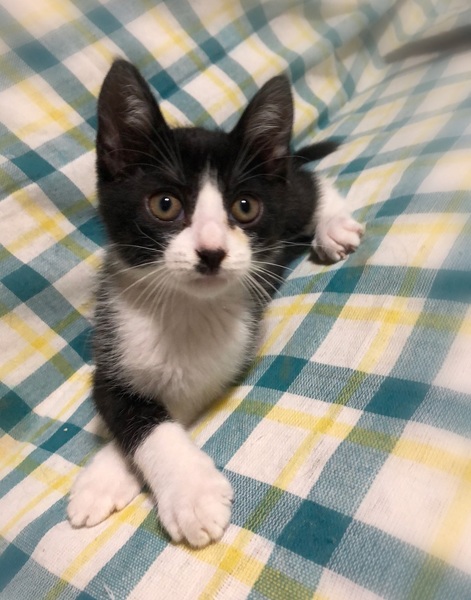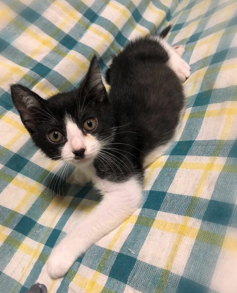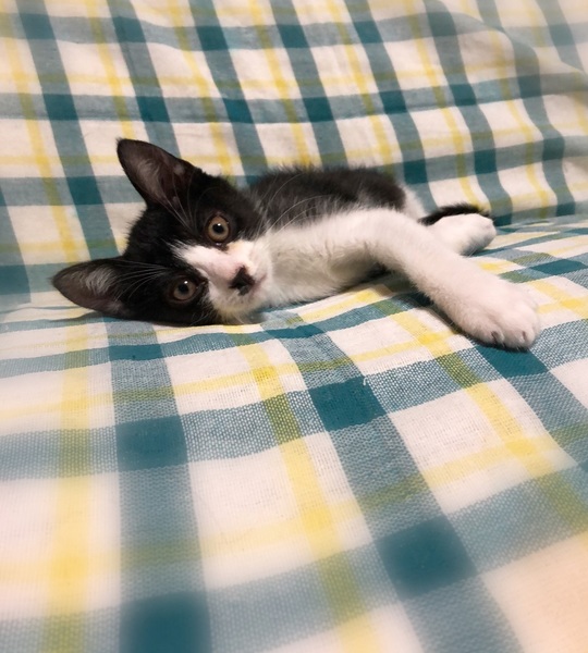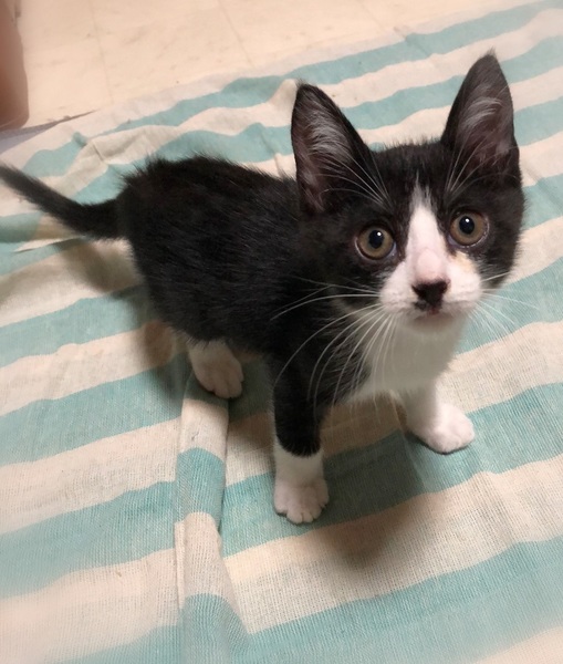 | 特徴(性格など) | 仮名、アトム 少し長めの被毛・スモーク黒のハチワレ男の子 身体にうっすらとシマシマが入っています。 環境に慣れるのが早く、甘えん坊でマイペースな性格です。 兄妹で遊んでいる最中に姿が見えないと思っていると、お気に入りの場所で熟睡していたりします。 |