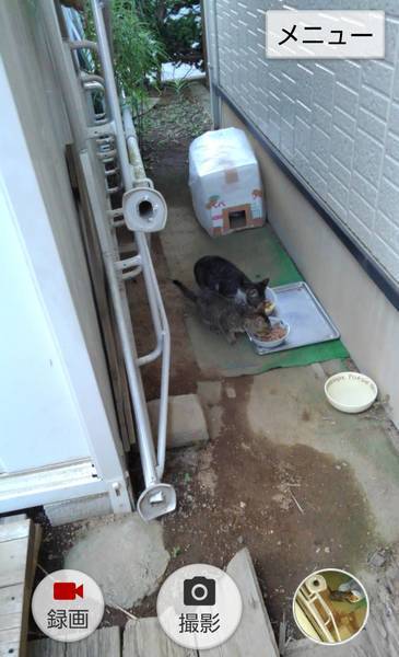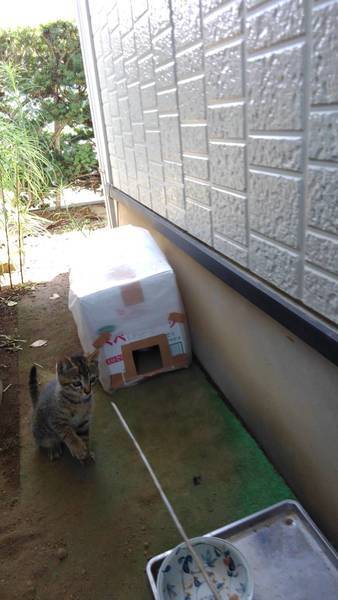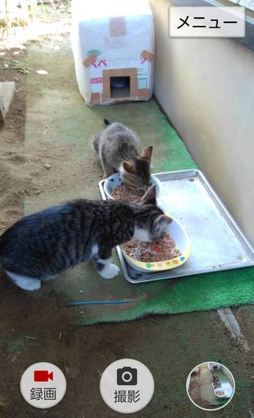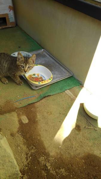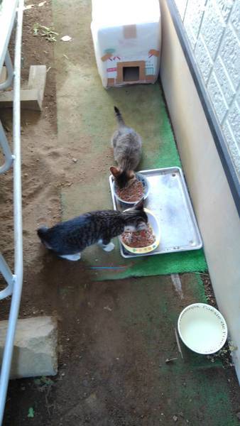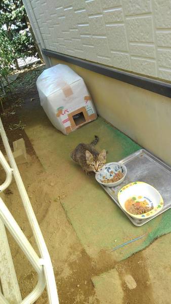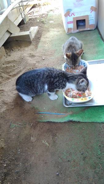 | 特徴(性格など) | 1匹目。黒トラで足が白、こちらの方が用心深く、近寄ると逃げてしまいます。 2匹目。茶トラ、人懐こく近寄っても逃げませんが、まだ触ったり近寄ってきてはくれません。 |