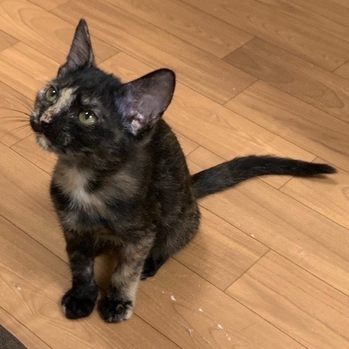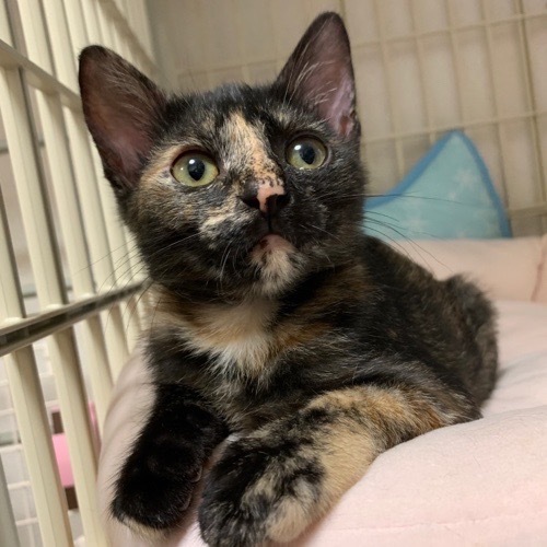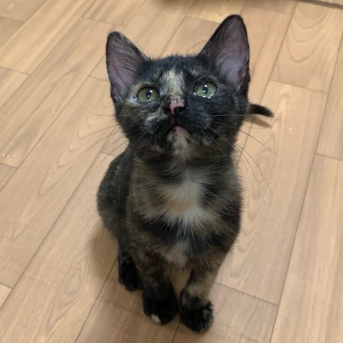 | 特徴(性格など) | 保護したばかりの頃は、ちょっとシャイで恥ずかしがり屋さん。兄弟の後ろに隠れてしまうことが多かったのですが、今はとっても活発で元気いっぱいな女の子になりました! 運動神経もよくて、身軽。高いところにも軽々ジャンプ!ダッシュ力もすごいです(笑) 大きい子も大好きで、尻尾をぴんと立ててくっついたり、乗っかったりしています。 最近は近くに行くだけでゴロゴロ言ってくれ、撫でるとうっとり。個性的な色柄で、とても賢く可愛いねねちゃんです。 |