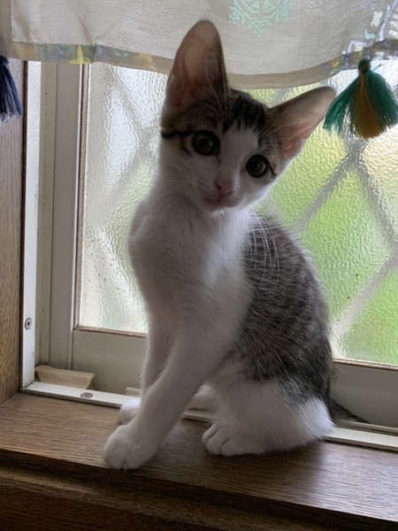| 特徴(性格など) | キジ白の長尻尾。 恥ずかしがり屋ですが、自分をもっている芯の強い子です。 |