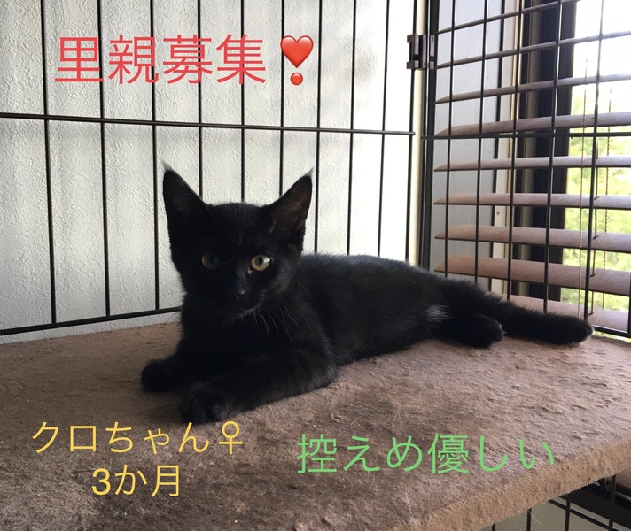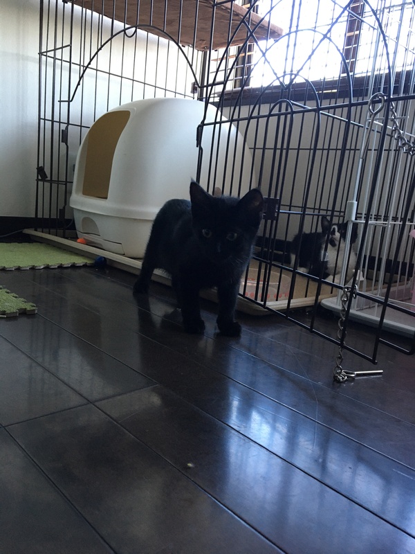 | 特徴(性格など) | ●黒 ♀3か月 尻尾短い お腹少し白毛 撫でるとゴロゴロいいます。 母親から人間を信用するなと教えられているので慣れるのに少し時間はかかりますが、保護時より慣れてきてます(^^) |