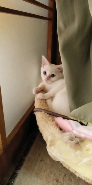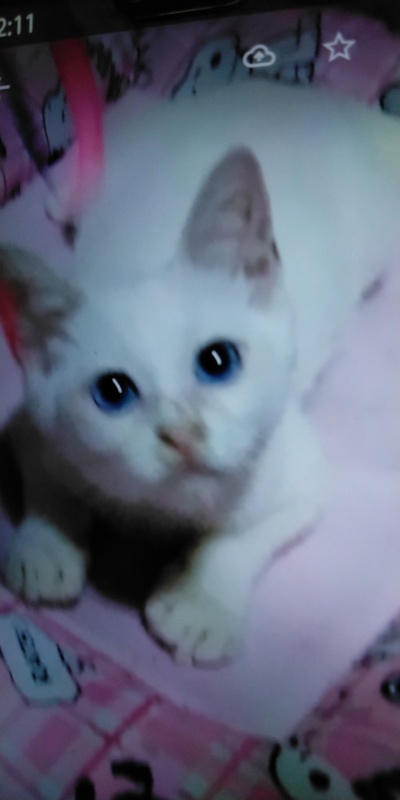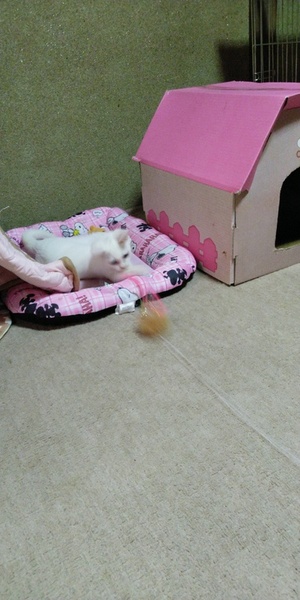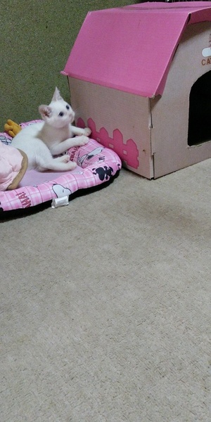 | 特徴(性格など) | ブルーアイの綺麗な白猫です。 性格もおとなしく、飼いやすいと思います。カリカリやパウチを食べています。トイレのしつけもできています。 |