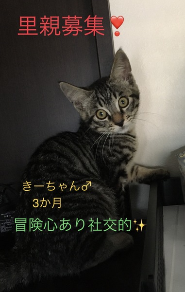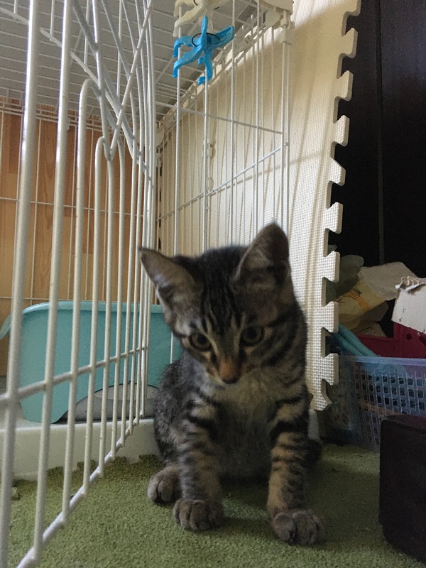 | 特徴(性格など) | ●キジトラ♂3か月 足少し短い 尻尾短い 撫でるとゴロゴロいいます。 母親から人間を信用するなと教えられているので慣れるのに少し時間はかかりますが、保護時より慣れてきてます(^^) |