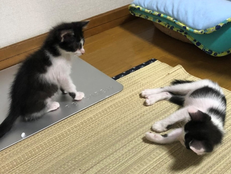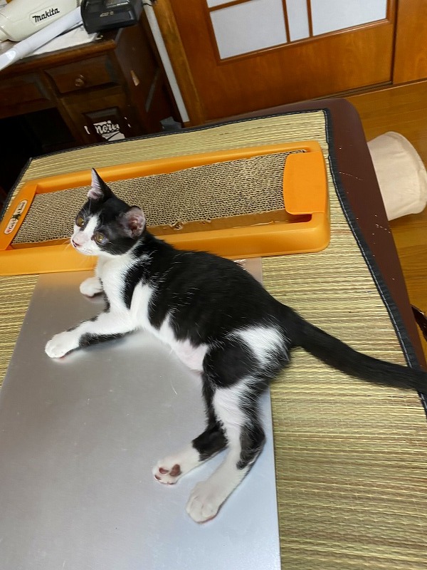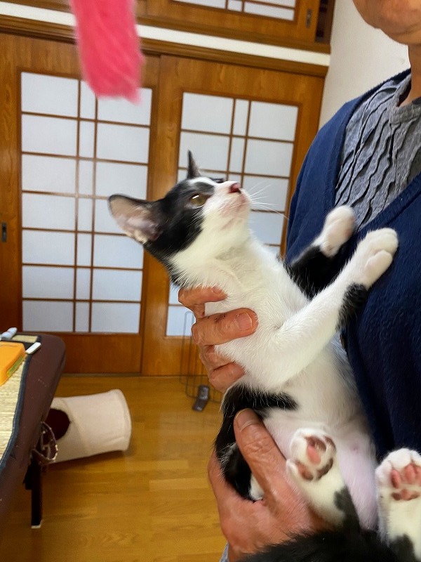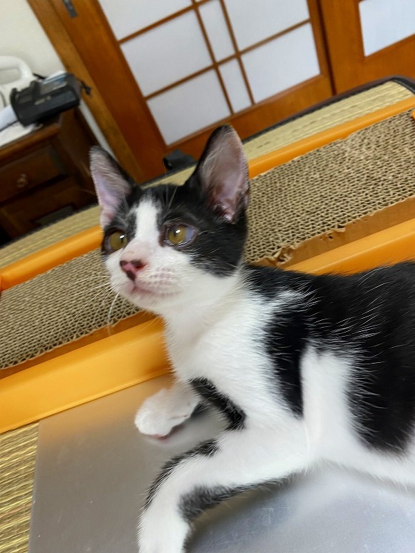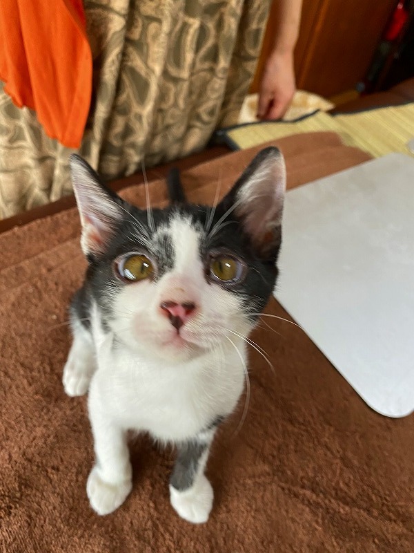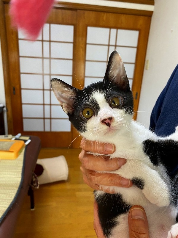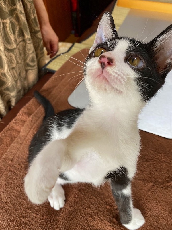 | 特徴(性格など) | ●猫の種類(色、柄、特徴) 白黒MIX 仮名:十和(トワ)くん オス 生後2ヶ月弱 ●保護した日 2020年6月初旬 ●保護している場所 春日市 ●現在の健康状態 風邪をひいていましたが、薬を飲ませて改善してきました。 トイレしつけ済み ノミ・ダニ駆除済 ●日頃の様子 保護当時は風邪で体調が悪く、2~3日はミルクもなかなか受け付けませんでしたが その後、ミルクもよく飲むようになり、離乳食もよく食べて、元気に走り回るように なりました。 いつも2匹で仲良く遊んでいます。 好奇心も旺盛で、おもちゃで遊ぶのも好きです。 尻尾も真っ直ぐできれいです。 |