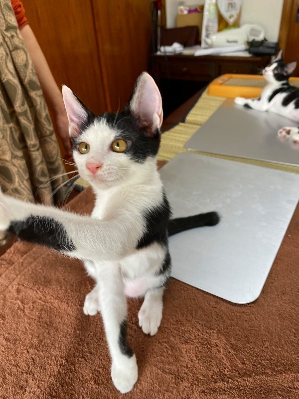 | 特徴(性格など) | ●猫の種類(色、柄、特徴) 白黒MIX 仮名:十希(トキ)くん オス 生後2ヶ月弱 ●保護した日 2020年6月初旬 ●保護している場所 春日市 ●現在の健康状態 風邪をひいていましたが、薬を飲ませて改善してきました。 トイレしつけ済み ノミ・ダニ駆除済 ●日頃の様子 保護当時は風邪で体調が悪く、2~3日はミルクもなかなか受け付けませんでしたが その後、ミルクもよく飲むようになり、離乳食もよく食べて、元気に走り回るように なりました。 いつも2匹で仲良く遊んでます。 お膝大好きの甘えん坊さんです♪ |