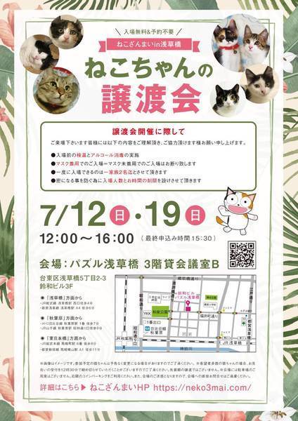 | その他(譲渡条件など) | 【新型コロナウィルス感染予防対策について】 7月の譲渡会開催に際し、ご来場下さいます皆様には以下の内容をご理解頂き、ご協力頂けます様お願い申し上げます。 ●入場前の検温とアルコール消毒の実施 ●マスク着用でのご入場=マスク未着用でのご入場はお断り致します ●入場人数の制限=一度に入場できるのは40名迄とさせていただきます ●時間と人数の制限=密になる事を防ぐ為に入場人数とお時間の制限を設けさせて頂きます その為お待たせしてしまう場合もございます。 あらかじめご了承下さい。 里親に決定された方は当日説明会にご参加頂きますのでお時間に余裕を持ってご来場下さい 諸々の制限がございますが、安心・安全な譲渡会運営のためにご理解・ご協力いただきますようお願い申し上げます。 ~~~~~~~~~~~~~~~~~~~~~~~~~~~~~~ ★仔猫ご希望の里親様★ 仔猫ちゃんたちは、まだ体がしっかりしていない赤ちゃんです。 下痢だけでも数時間対応ができなかっただけ死に至る事もあります。 その為、月齢に応じたお留守番時間を設けさせていただいております。 また、子猫ちゃん(6ヶ月未満)の里親様には子猫支援金のご協力をお願い致しております。 ★猫ちゃんとのお見合いは譲渡会で!★ ねこざんまいの猫ちゃんは譲渡会でのお見合いのみとなります。 『この子はいつ譲渡会に参加するの?』『譲渡会場の場所はどこ?』など はねこざんまいホームページをご覧ください。 https://neko3mai.com/ ★楽しく猫ちゃんと触れ合って★ ねこざんまい譲渡会は、猫ちゃんも里親様も保護主も笑顔で過ごせる譲渡会を目指しています。 これから20年以上、楽しい時も、悲しい時もいつも傍にいてくれる大切な家族になる猫ちゃんです。 会場には沢山の猫ちゃんがいます。 1匹1匹、触れ合って猫ちゃんとお話ししてください。 『初めて猫ちゃんを家族に迎える方』 『先住猫ちゃんのお友達を迎える方』など トライアルの仕方や先住猫ちゃんと仲良くなるコツなど経験豊富な保護主やスタッフにお気軽にご相談ください! 猫を愛し、そして猫に愛されている猫好きスタッフと保護主がアドバイスさせていただきます。 ★里親希望のみなさまへ★ ペットではなく、家族一員としてたっぷり愛情を注いでくださるご家庭をお待ちしております。 恐れ入りますが、 ・学生の方 ・一人暮らし、同棲中の方 ・子猫、若猫希望の60歳以上のみのご家庭 ・脱走防止対策にご協力いただけない方 は原則譲渡を遠慮させていただいております。 ただし、預かりボランティアさんとして新しい家族が決まるまでの間、猫ちゃんを預かっていただく道もございます。 参加猫ちゃんは、それぞれ保護主(実際に猫ちゃんを自宅に入れ、保護をしている方)が異なります。 詳しい条件なども異なる場合がございますので、会場内で直接保護主とお話ください。 〖共通条件〗 1.終生飼育 2.完全室内飼い 3.脱走防止対策へのご協力 4.避妊去勢手術 5.契約書類へのサイン 6.定期報告 7.医療費等の負担 当日の猫ちゃんを連れて帰ることはできません。後日、保護主が里親様のご自宅までお届け致します。 その為、移動の際の猫ちゃんの負担を月齢などから考慮し、お届け地区を限定させて頂くこともございますのでご了承ください。 ご理解とご協力のほど宜しくお願い致します。 ☆よくある質問☆ ・譲渡の条件 ・ご負担頂く費用 ・譲渡会の場所等は ホームページに詳しく掲載させて頂いておりますのでご覧ください。 https://neko3mai.com/ メールでのお問い合わせはすぐにご返答出来ない場合がございますのでご了承ください。 ホームページ https://neko3mai.com/ お問い合わせ http://www.neko3mai.com/contact/form_general.html ねこざんまいブログ http://ameblo.jp/neko3mai/ |
