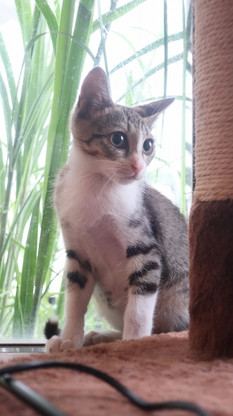 | 特徴(性格など) | 心配性で弟分の「ちくわ」のあとを付いて回る、世話焼きなお姉さんのようだと思っていました。 ※ 病院で診断の結果「男の子」でした! 少し怖がりですが、猫じゃらしで遊ぶのが大好き。 ニャンプロも大好き。 「ちくわ」が眠たいときに、絡んでいって怒られています。 |