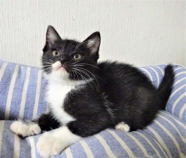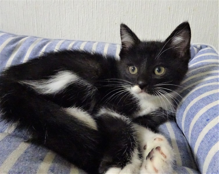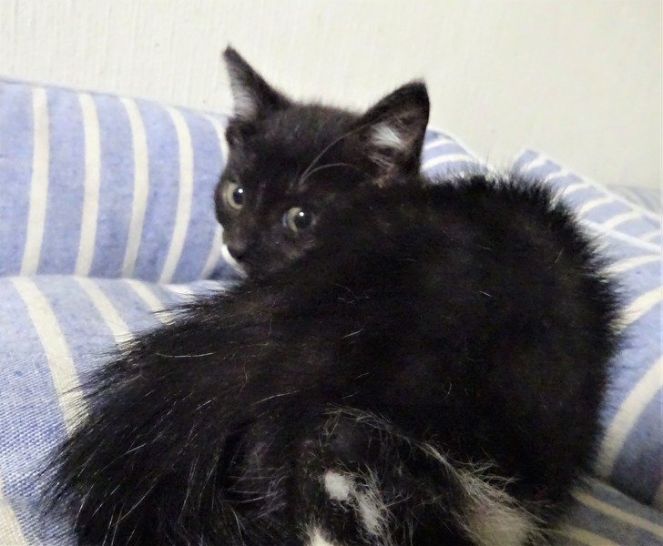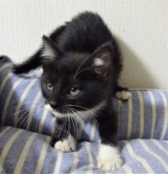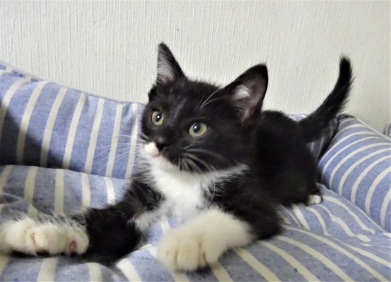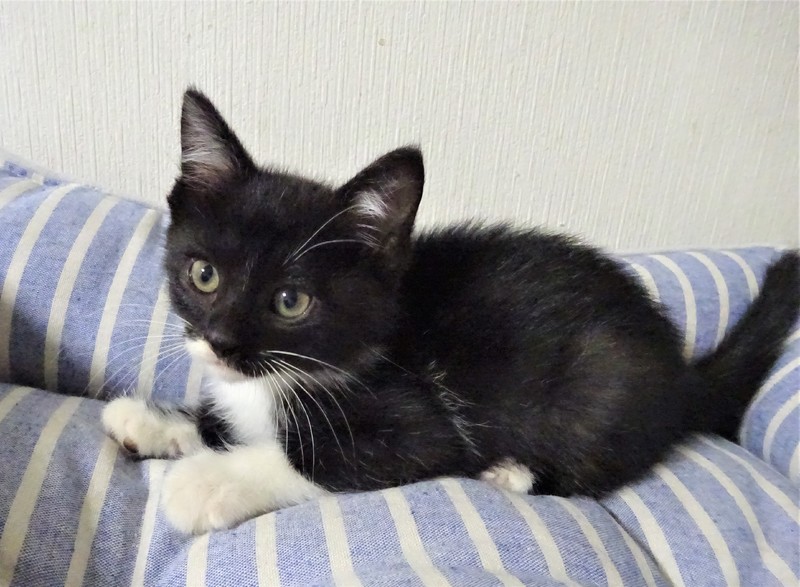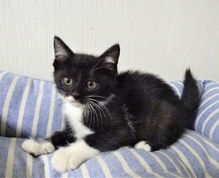 | 特徴(性格など) | 仮名: ジェット君(オス) 毛色: 殆ど黒の黒白、尻尾長い 性格: 保護して日が浅いため、個性ははっきりわかっていませんが、少しビビリで、怖くなると威嚇しますが、攻撃性はなく、抱っこも出来ます。 初めは、ケージから出せ出せコールしましたが、いまは大人猫を呼んだり、ご飯の催促の時に鳴いたりします。 兄妹一緒なので、猫社会の学習はしていると思います。ですが、まだ大人猫とどうかは解っていません。 まだ小さいので安心のためには、ケージをお使いになる事をお勧めします。 暫くは(2回目ワクチン接種する頃まで)留守番時間の短いご家庭で見守ってくださるようお願い致します。 ノミ取り済 検便済 駆虫済 3種混合ワクチン済 猫エイズ・白血病ウィルス検査はともに陰性です |