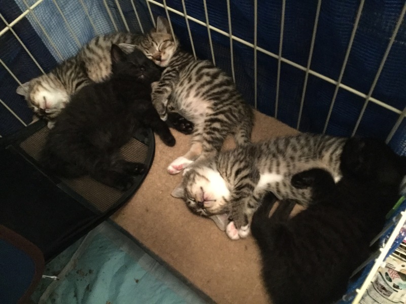 | 里親募集する理由 | 子供5匹も保護し、離乳したことから避妊手術をおこないました。ところが、白血病陽性と出てしまい祈るような気持ちで検査した子供たちも全員陽性でした。先生はからは自己免疫力でウイルスが消えるかもしれない(親子とも)との説明を受け3ヶ月後の再検査を進められています。本来ならそこまで待てるのですが老齢の先住猫2匹がストレスから来る体調不良によってご飯も食べられないし、おしっこも出なくなり、離しておける部屋もなく早急に分離するよう言われ、急遽急いで募集することとなりました。 お母さんは黒猫で、1歳 緑色の目をしたきれいな子です。すでに手からチュールをなめます。すぐ人慣れするでしょう 子供は5匹 ①黒のしっぽありはどうやら長毛のようです。大きくなった姿が是非みたいです。オス ②黒しっぽなし お母さんも曲がったしっぽで似たんでしょうか。ないわけではありませんがくっついています。オス ③手と足半分まで白いとらねこ。一番体重は軽いが誰よりも興味津々でチャレンジャー ママのご飯だって食べちゃいます。オス ④白い部分は③より少ないが元気でやんちゃな子です。③と相性がいいようです。⑤ トラだが模様はあまりはっきりしていない、唯一の女の子。保護したときに一人だけ「ぽんっ!ぽんっ!」と。威嚇してきたので相性ぽんちゃん。どの子も一度も土を踏んだことがなかったのできれいですが、一応駆虫薬も飲みました。 やっとつかみかけた幸せだったのに、こんなことになるなんて不憫でなりません。なんとかして幸せになってもらいたく、キャリアの子がすでにいるご家庭、もしくは親子、兄弟など二匹で飼ってくれる方を是が非でも見つけたいです! 今は親子でほんとにのんびり過ごしています。ストレスなく過ごせれば発症もしないかと思います。天寿を全うできる子も多いと聞きます。ぜひぜひよろしくお願いいたします。 |