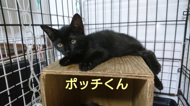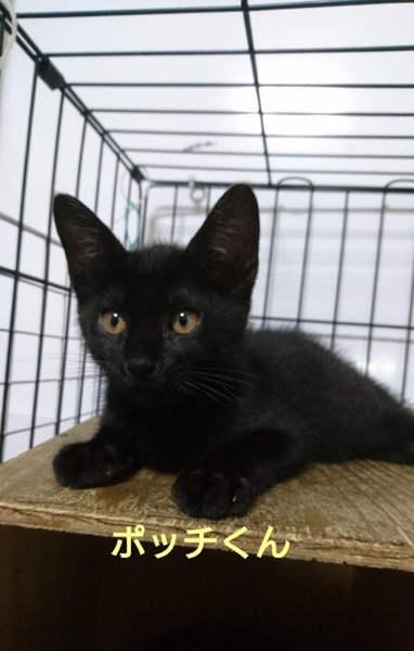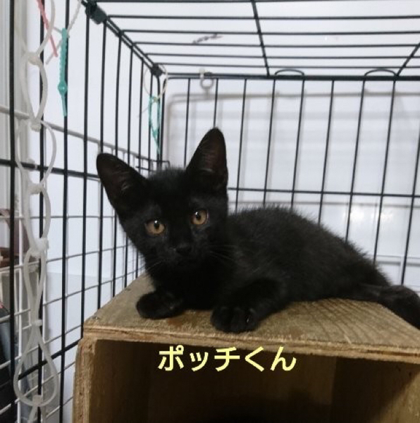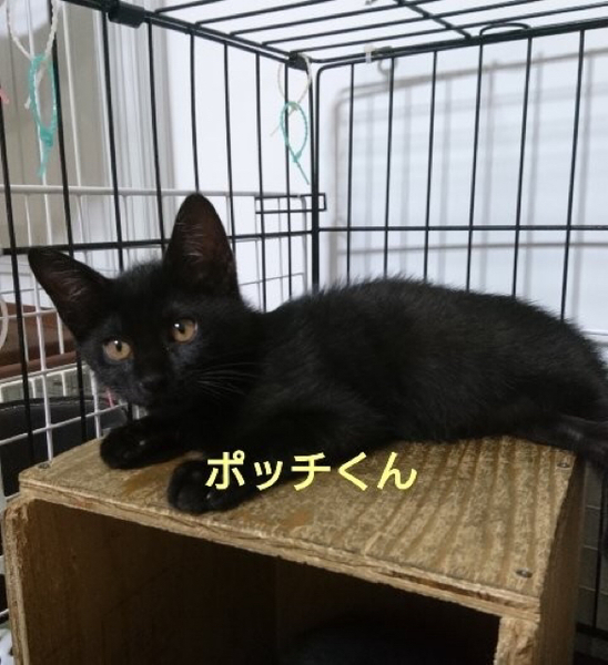 | 特徴(性格など) | 仮名「ポッチくん」 ワクチン済み、駆虫済み、ウイルス検査白血病、エイズ共に陰性 黒の男の子。 兄妹の中で1週間早く保護されてきました。(初めはこの子1匹だと思われていました)人間大好きのかまってちゃん男子です。 サークルの中を掃除する時でも真っ先に飛んできて人の手にまとわりついてくる様な子です。 猫じゃらしやボールなどのオモチャで遊ぶのも大好きです。 月齢的には1匹での譲渡も可能ですが、まだ猫同士で遊びたい時期ではあるので、兄妹2匹での受け入れをしてもらえたらありがたいと思っています。 小学生以上でしたらお子さんのいるご家庭でも大丈夫です。 C308865のソルトくん C308866のソイちゃん C308870のシュガーちゃん と兄妹です。 |