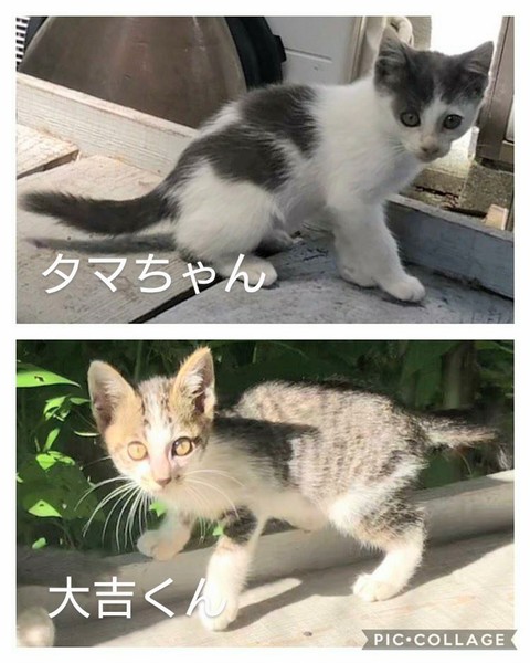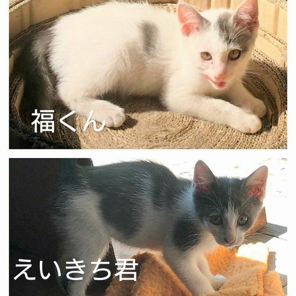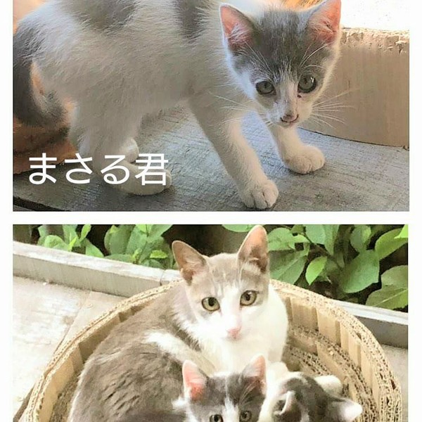 | 特徴(性格など) | 白とグレーの綺麗な色合いの猫ちゃんと、キジシロが1匹おります。 性格はまだよくわかりませんが、子猫らしく元気に遊んだりしています。 野良ちゃんが産んだ子達なので、少しビビリちゃんではありますが、まだ子猫なのですぐに環境になれると思います。 |