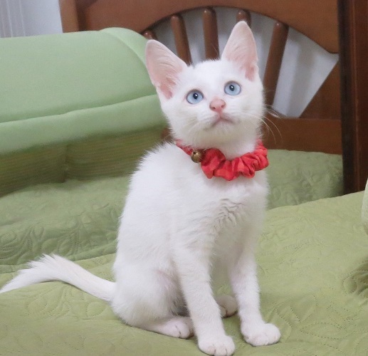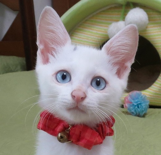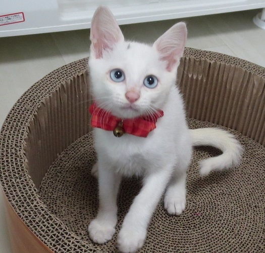 | 特徴(性格など) | 保護した時点では姉妹の中でとりわけ小さいように感じたのですが、元気な性格で遊ぶのも食べるのも積極的、なかなか頼もしいチビさんでした。 小さいのでまだ性格は判りませんが、好奇心も旺盛で、明るく怯まずという感じです。 身体つきも尻尾もすっきりと細身で綺麗なブルーアイが自慢。性格が良い子だと思います。 |