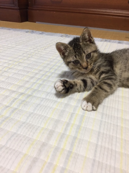 | 特徴(性格など) | キジトラ、白靴下 ちょっと怖がり、でもそっと近づいてきてくれます。食欲旺盛。ミルク大好き。 |