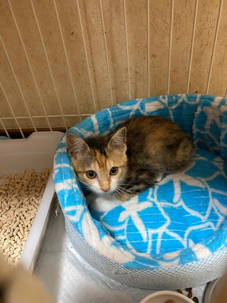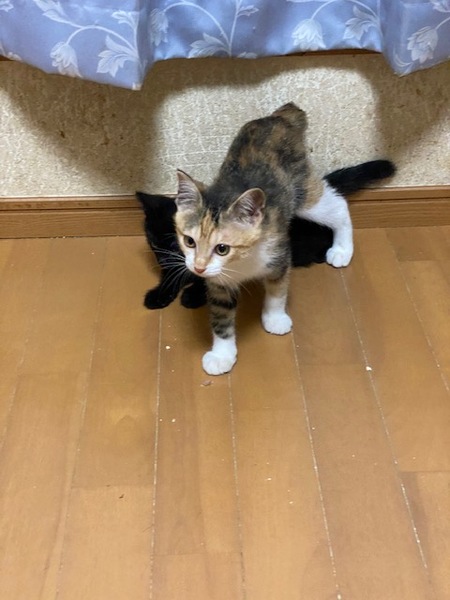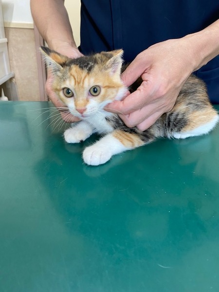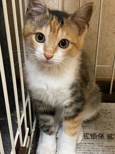 | 特徴(性格など) | 名前:美鈴 三毛猫になります。 シャイですが、抱っこも出来ますし触れます。猫じゃらしが大好きで夢中になって遊びますよ。 トイレ完璧、多頭飼いも大丈夫です。 健康状態は良好です。 3種混合ワクチン(1回接種済、2回目のワクチンを7月25日に予定しています) 猫エイズ白血病:陰性 蚤ダニ駆虫済 腸内寄生虫駆虫済 検便は現在陰性です。 食欲旺盛でとっても元気です。 |