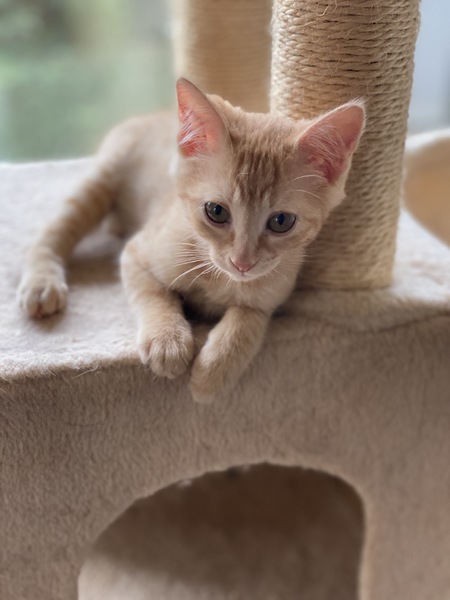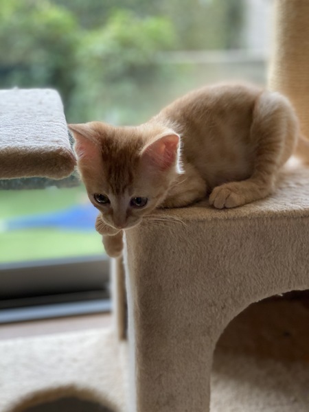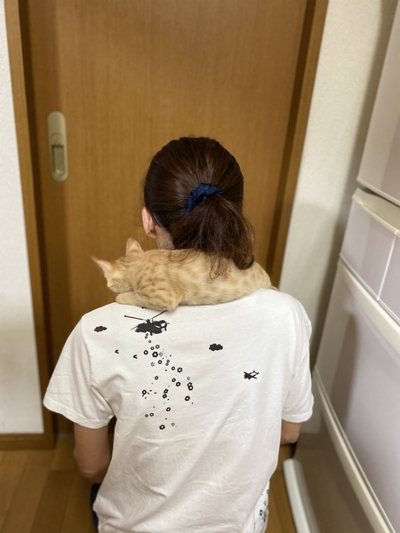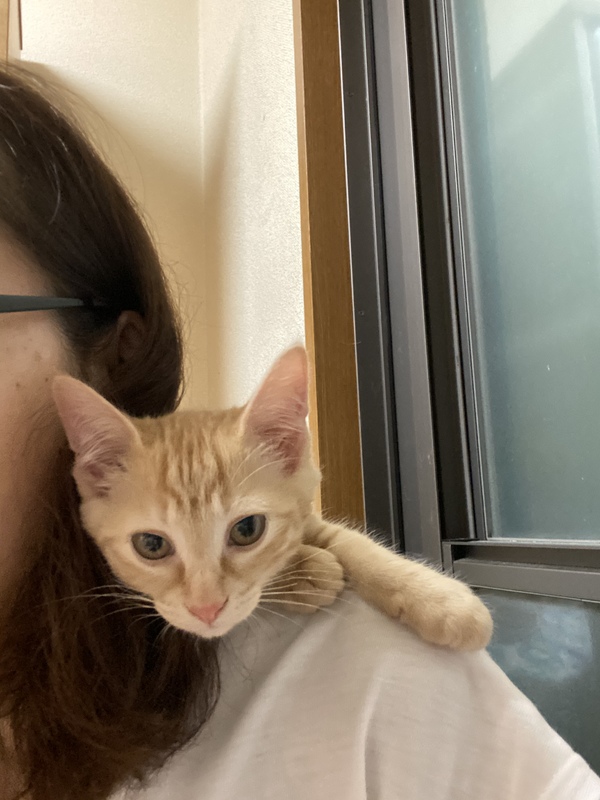 | 特徴(性格など) | お転婆で常に膝の上に乗る甘えん坊です。膝の上から肩によじ登り首の後ろに座るマフラー猫でもあります。子猫らしく甘噛みしたりしますが、兄妹と育っていて、今も成猫たちと暮らしてるので怪我をする程は噛みません。寝る時は寝室に誘導する程の人大好きさんです。 | ||