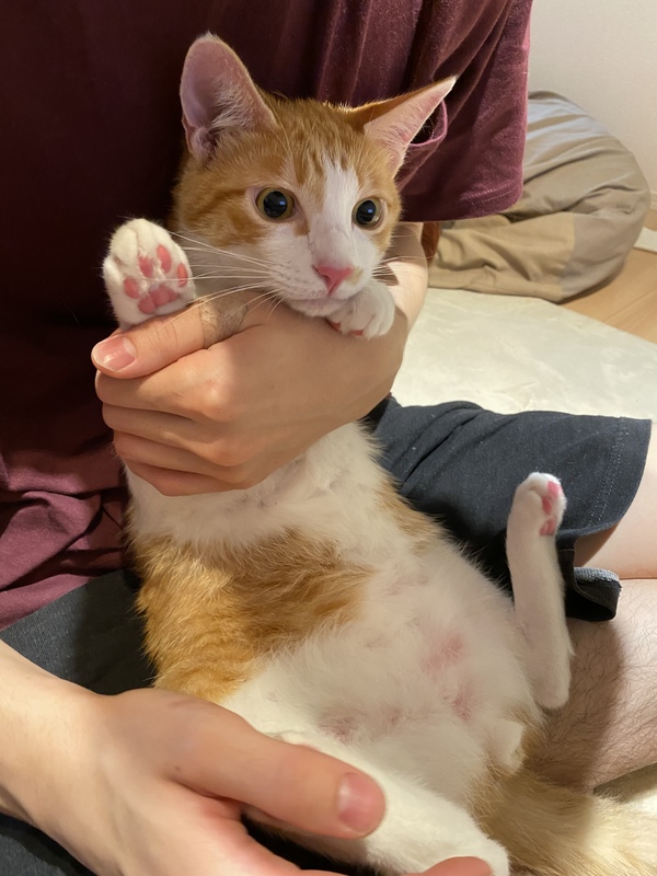| 特徴(性格など) | かなり穏やかで、人馴れ抜群の子なので初めて猫を飼われる方も安心かと思います。 ・茶白 ・♂ ・4.3kg ・こむぎくん(仮) ・抱っこ 撫で OK ・めったに鳴きません ・大きめ(4.3kg) とても健康です。 ご飯もたくさん食べ(好き嫌いは無いようです) お水もたくさん飲みます。 ストレスを感じるとグルーミングをたくさんしてしまうようで、お腹のあたりの毛が少し抜けていますが、病院ではなにも問題ないと診断されました。 |