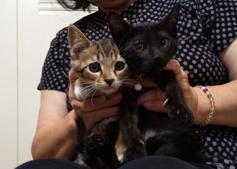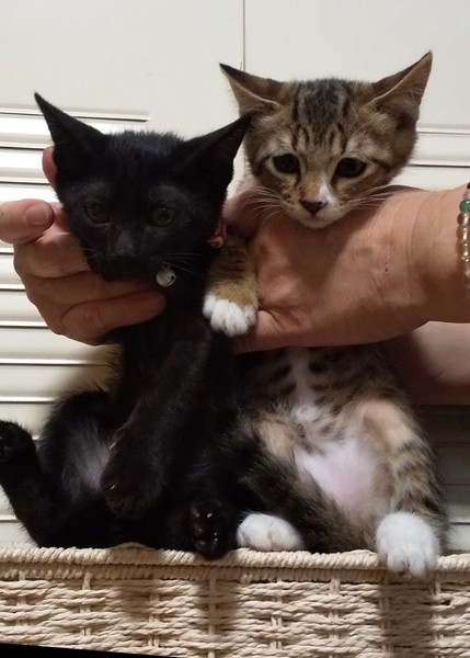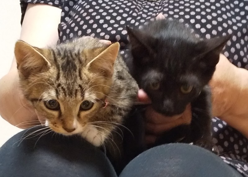 | 特徴(性格など) | とても仲良しな兄弟です。 黒が男の子 キジシロが女の子 日に日に人馴れして今はゴロゴロと喉を慣らしてくれます。 食欲も良く元気一杯です。 まだ小さく遊び盛りで甘えたい時期ですので兄妹一緒に迎えて下さる方を希望致します。 約生後2ヶ月です。 2匹共に風邪などなく健康状態は良好です。 ●ウイルス検査(白血病とエイズ)マイナス ●3種ワクチン一回済み(7/10) ●便検駆虫済み ●ブロードライン投薬済み (ノミ等駆除) ●健康診断しました。 ●トイレの躾済んでます。 ●現在約1000gです。(7/24現在) |