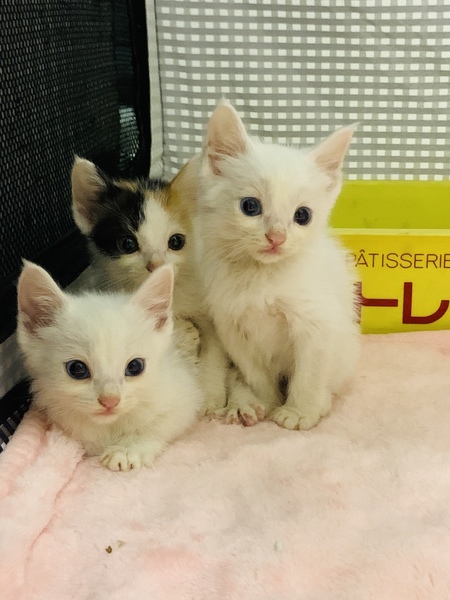 | 特徴(性格など) | 親子猫です。 白猫2匹は雄と雌です。 もう1匹は三毛猫の雌です。 親猫は白で茶色のブチです。 |