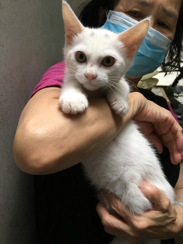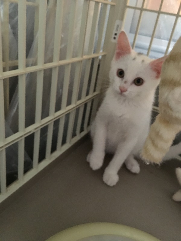 | 特徴(性格など) | 名前は、ベビーちゃん。頭に小さいグレー模様あります。体全体は白色です。尾尻は、長くきれいです。 とっても、人馴れしてます。 抱っこも大丈夫、シャーも無し、人大好きなこです。 なるべく、先住猫ちゃんいる方希望ですが…1匹飼育の方はご相談致します。トライアル期間あります。健康状態良好です。 |