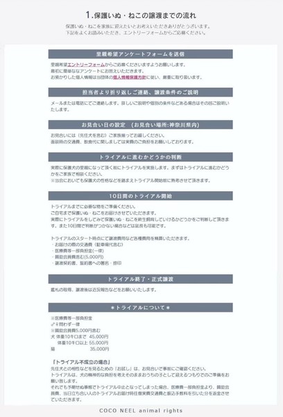 | その他(譲渡条件など) | 京都から車で3時間程度 それ以上の場合もご相談ください。 ✱応募方法✱ ※いつでも里親募集中からのご応募は受け付けられません。 里親希望の方は、以下のURL又は画像に記載の『譲渡のまでの流れ』『譲渡のルール・応募条件』『譲渡に関してのお願い』のご確認のうえ、『里親希望エントリーフォーム』よりご応募お願い致します。 ※お返事には1週間程度のお時間が掛かる場合があります。 『譲渡のまで流れ』 https://coconeel.wixsite.com/website/bosyunonagare 『譲渡に関してのお願い』 https://coconeel.wixsite.com/website/blank-4 『譲渡のルール・応募条件』 https://coconeel.wixsite.com/website/blank 『里親希望エントリーフフォーム』 https://coconeel.wixsite.com/website/entry ※ご質問等ある場合は、フォームの最後の欄にお書き添えください。 ※先着順ではありません。 犬の性格・年齢・病気等を考慮し、多方面から検討させていただきます。 |
