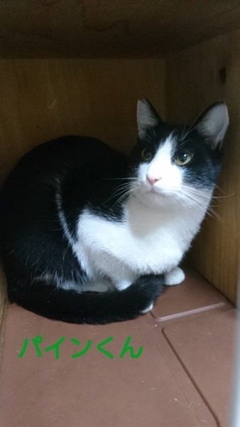 | 特徴(性格など) | 仮名「パインくん」 ワクチン済み、駆虫済み、ウイルス検査白血病、エイズ共に陰性 黒白の男の子。 おっとりとして優しい性格なのでグイグイくるタイプではありません。 他の保護猫達の輪にいても、じっと見守っている様な感じの子です。 家庭に入って飼い主さんを独り占め出来る環境になれば抱っこも好きな子なので、積極的に甘える仕草が出るのではないかと思います。 他の猫とも争う事もしないので先住さんがいるご家庭でも大丈夫です。 |