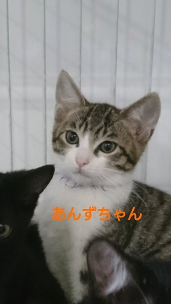 | 特徴(性格など) | 仮名「あんずちゃん」 ワクチン済み、駆虫済み、ウイルス検査白血病、エイズ共に陰性 キジ白の女の子。 マイペースでおとなしい性格です。 まだ自分から人にすり寄って甘える事はありませんが、抱っこも出来るので家庭に入れば馴れるのも早いと思います。 猫じゃらしなどで遊ぶのは好きなので一緒に遊んであげる事は出来ます。 月齢的には1匹での譲渡も可能ですが、兄妹2匹での受け入れをしてもらえたらありがたいと思っています。 小学生以上でしたらお子さんのいるご家庭でも大丈夫だと思います。 C309309のパインくん C309310のライチくん C309313のいちごちゃん C309314のりんごちゃん C309316ぶどうちゃん と兄妹です。 |