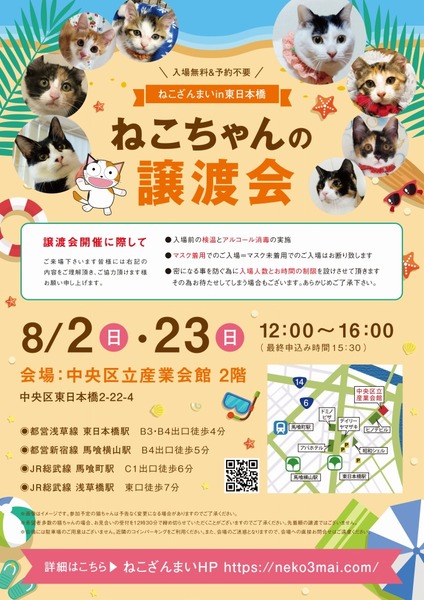 | その他(譲渡条件など) | 【新型コロナウィルス感染予防対策について】 8月の譲渡会開催に際し、ご来場下さいます皆様には以下の内容をご理解頂き、ご協力頂けます様お願い申し上げます。 ●入場前の検温とアルコール消毒の実施 ●マスク着用でのご入場=マスク未着用でのご入場はお断り致します ●入場人数の制限=一度に入場できるのは40名迄とさせていただきます ●時間と人数の制限=密になる事を防ぐ為に入場人数とお時間の制限を設けさせて頂きます その為お待たせしてしまう場合もございます ●会場利用規約により、ご来場者様の連絡先を控えさせていただきます あらかじめご了承下さい 里親様決定は14時以降となります。 その後、迎え入れ準備の説明等のお時間も頂戴しますので、お時間に余裕を持ってご来場下さい。 諸々の制限がございますが、安心・安全な譲渡会運営のためにご理解・ご協力いただきますようお願い申し上げます。 ~~~~~~~~~~~~~~~~~~~~~~~~~~~~~~ ★仔猫ご希望の里親様★ 仔猫ちゃんたちは、まだ体がしっかりしていない赤ちゃんです。 下痢だけでも数時間対応ができなかっただけ死に至る事もあります。 その為、月齢に応じたお留守番時間を設けさせていただいております。 また、子猫ちゃん(6ヶ月未満)の里親様には子猫支援金のご協力をお願い致しております。 ★猫ちゃんとのお見合いは譲渡会で!★ ねこざんまいの猫ちゃんは譲渡会でのお見合いのみとなります。 『この子はいつ譲渡会に参加するの?』『譲渡会場の場所はどこ?』など はねこざんまいホームページをご覧ください。 https://neko3mai.com/ ★楽しく猫ちゃんと触れ合って★ ねこざんまい譲渡会は、猫ちゃんも里親様も保護主も笑顔で過ごせる譲渡会を目指しています。 これから20年以上、楽しい時も、悲しい時もいつも傍にいてくれる大切な家族になる猫ちゃんです。 会場には沢山の猫ちゃんがいます。 1匹1匹、触れ合って猫ちゃんとお話ししてください。 『初めて猫ちゃんを家族に迎える方』 『先住猫ちゃんのお友達を迎える方』など トライアルの仕方や先住猫ちゃんと仲良くなるコツなど経験豊富な保護主やスタッフにお気軽にご相談ください! 猫を愛し、そして猫に愛されている猫好きスタッフと保護主がアドバイスさせていただきます。 ★里親希望のみなさまへ★ ペットではなく、家族一員としてたっぷり愛情を注いでくださるご家庭をお待ちしております。 恐れ入りますが、 ・学生の方 ・一人暮らし、同棲中の方 ・子猫、若猫希望の60歳以上のみのご家庭 ・脱走防止対策にご協力いただけない方 は原則譲渡を遠慮させていただいております。 ただし、預かりボランティアさんとして新しい家族が決まるまでの間、猫ちゃんを預かっていただく道もございます。 参加猫ちゃんは、それぞれ保護主(実際に猫ちゃんを自宅に入れ、保護をしている方)が異なります。 詳しい条件なども異なる場合がございますので、会場内で直接保護主とお話ください。 〖共通条件〗 1.終生飼育 2.完全室内飼い 3.脱走防止対策へのご協力 4.避妊去勢手術 5.契約書類へのサイン 6.定期報告 7.医療費等の負担 当日の猫ちゃんを連れて帰ることはできません。後日、保護主が里親様のご自宅までお届け致します。 その為、移動の際の猫ちゃんの負担を月齢などから考慮し、お届け地区を限定させて頂くこともございますのでご了承ください。 ご理解とご協力のほど宜しくお願い致します。 ☆よくある質問☆ ・譲渡の条件 ・ご負担頂く費用 ・譲渡会の場所等は ホームページに詳しく掲載させて頂いておりますのでご覧ください。 https://neko3mai.com/ メールでのお問い合わせはすぐにご返答出来ない場合がございますのでご了承ください。 ホームページ https://neko3mai.com/ お問い合わせ http://www.neko3mai.com/contact/form_general.html ねこざんまいブログ http://ameblo.jp/neko3mai/ |