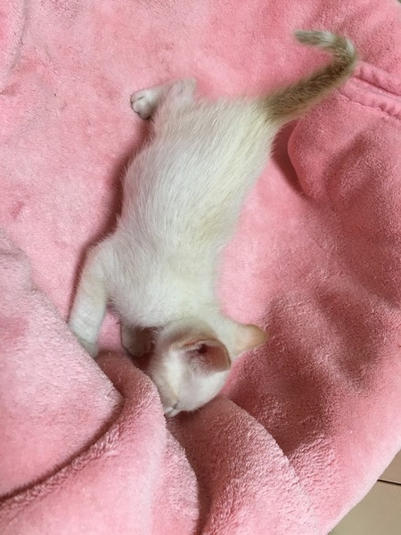 | 特徴(性格など) | ブルーアイの白猫君です。 尻尾と耳の先が薄い茶色です。 離乳食を食べています。 ノミダニ駆除、便検査済み。 |
