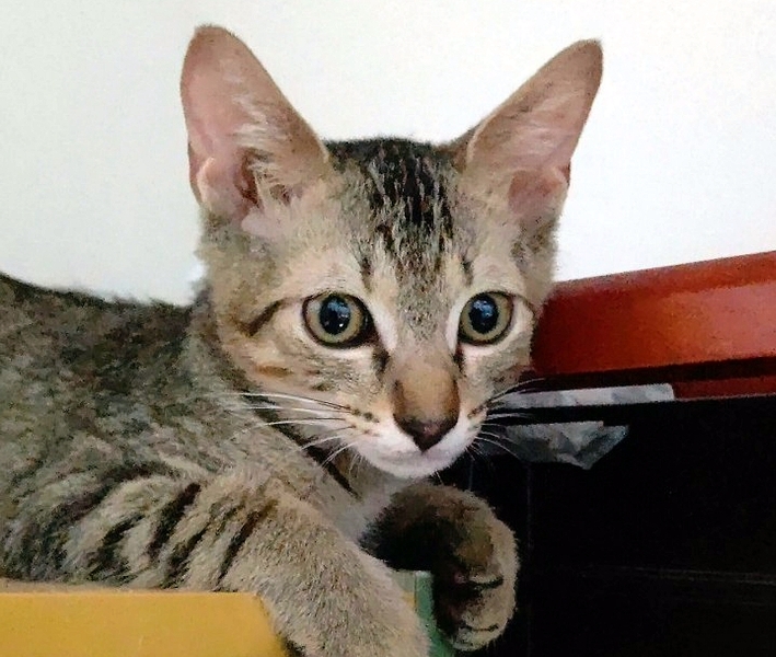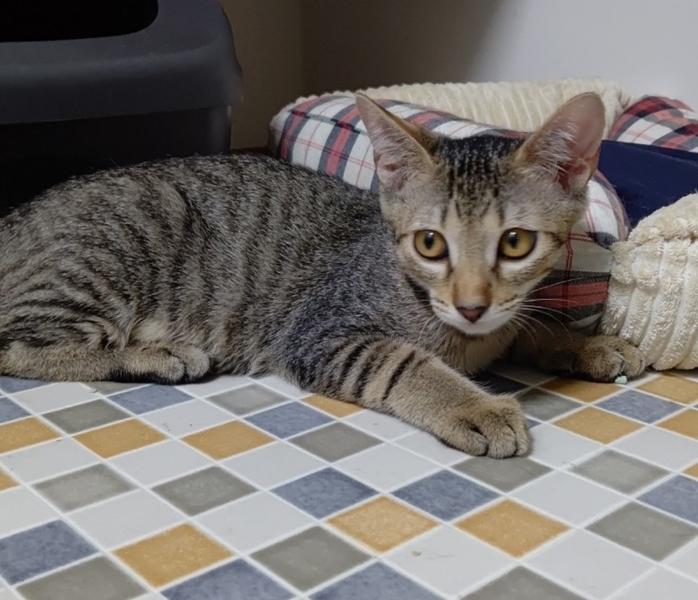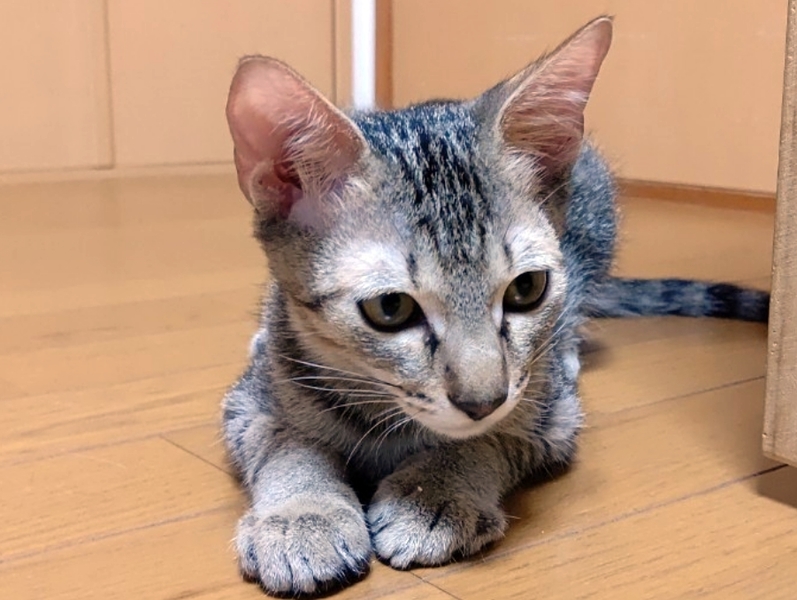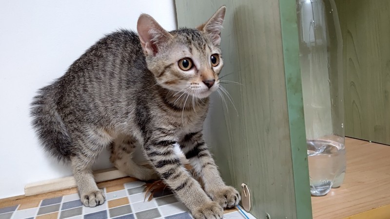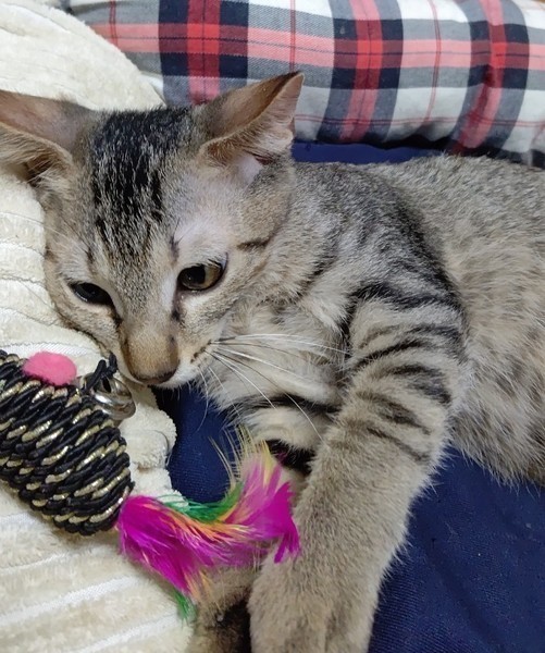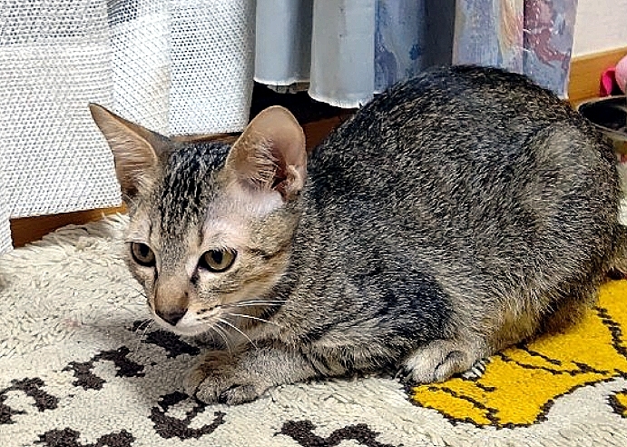 | 特徴(性格など) | 2020.4.15生まれ(推定) 毛色:キジトラ 長くてシマシマしっぽの男の子。 他の兄妹とのニャンプロでポカスカされてもなんのその♪ 根っからの元気パワーで遊びが大好きな優しい男の子です。 ご飯も良く食べてすくすく成長中♪ 4兄妹はみんな仲良しなので2匹ペアでホントのお家に迎えて頂けたら嬉しいです(>ω<〃)~♡ |