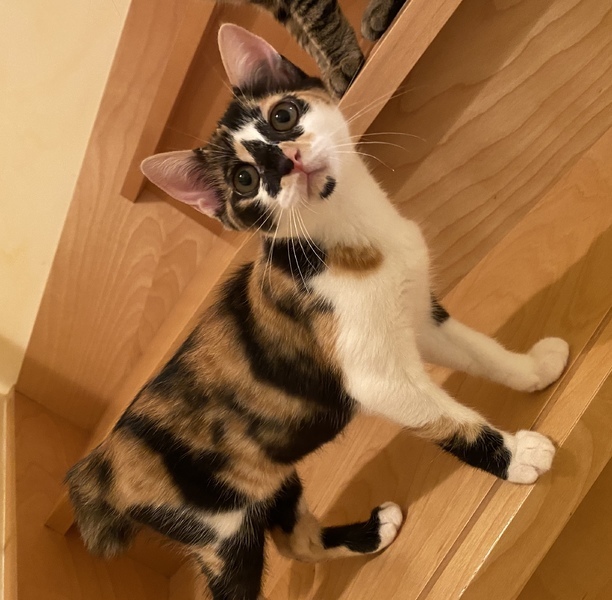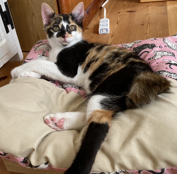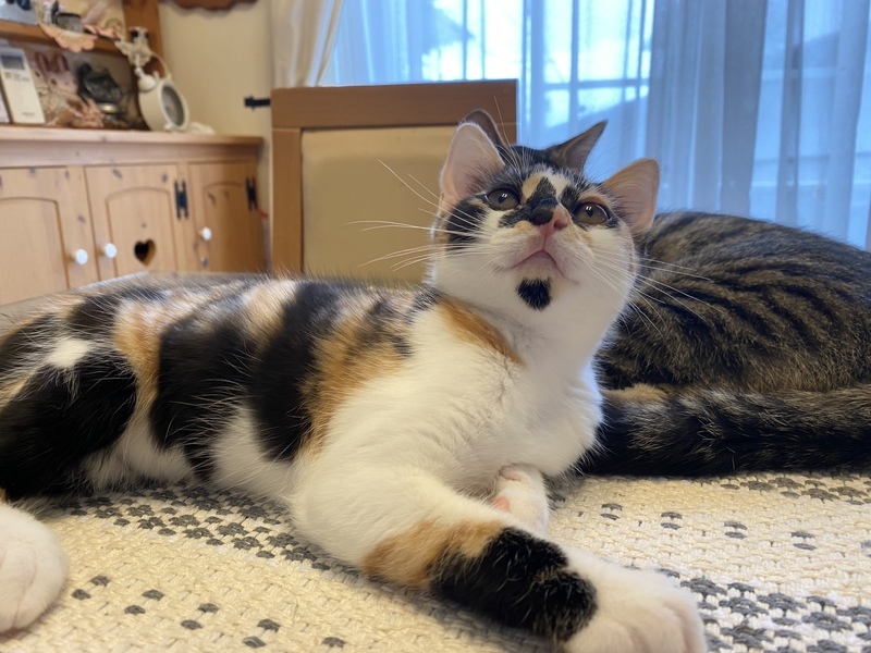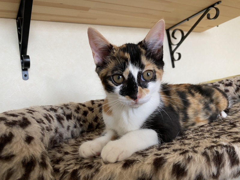 | 特徴(性格など) | 個性的な三毛柄 幸せを呼ぶ鍵しっぽです まん丸お目目と アゴのしたのポチッと黒模様がとってもチャーミングです とっても甘えん坊さんです 健康です ウィルス検査は白血病、エイズ共に 陰性です 証明書お渡しします。 トイレしつけ済 駆虫済 |