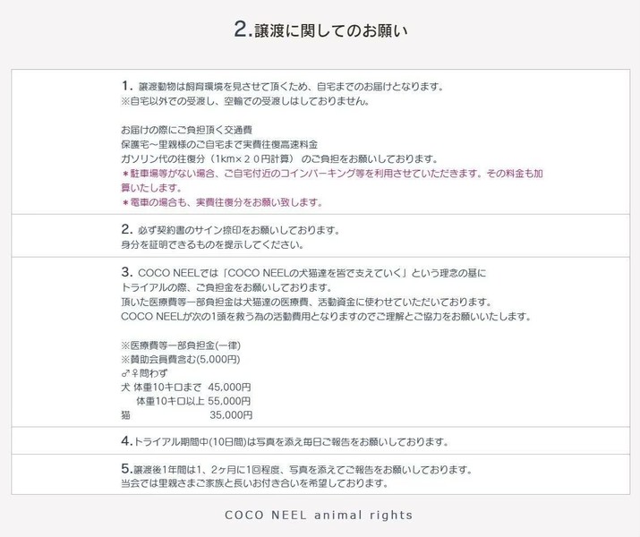 | 譲渡費用(医療費、交通費など) | 医療費負担金 40,000円(去勢手術、ワクチン代他含む) 賛助会員費 5,000円 預かり宅からお届け先までの実費往復交通費をいただきます 詳細はHPでご確認ください。 |