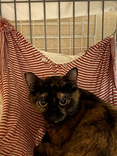 | 特徴(性格など) | 綺麗なサビ柄で、顔がとっても可愛い推定1歳の女の子です。 保護当初はシャーシャー&空気砲、猫パンチとかなり警戒心剥き出しでしたが、少しづつ攻撃性は薄れてきました。ですがまだまだ人馴れは進まず、今も触ったり抱っこしたりは出来ません。 ちゅーるが大好きで、ケージ越しですが指から直接舐めてくれます。舐めてる最中にアゴをなでることは出来ます。ドライフードもウェットフードもよく食べ、排泄も問題ありません。猫じゃらしにも反応してくれる元気な子です。 ですがまだまだ警戒心が強い子なので、この子の性格をご理解頂ける方で、猫飼い経験のある方を希望いたします。ケージ越しですが他の猫とも仲良く出来ますので、先住猫さんがいるご家庭でもいいかもしれません。 オンラインでお見合いも可能です。お声かけください。 |