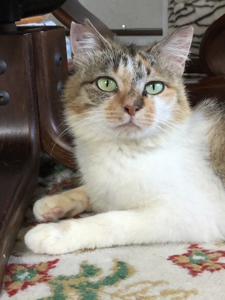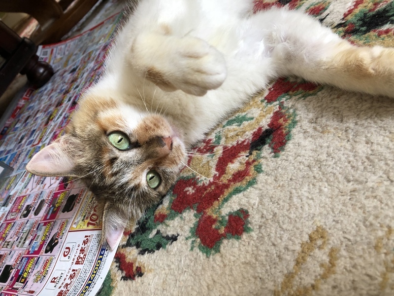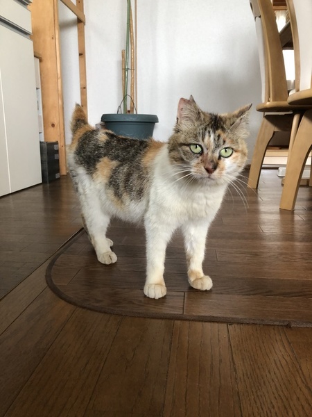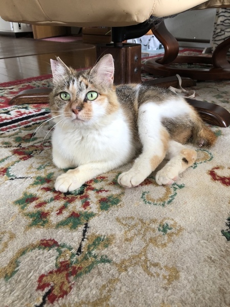 | 特徴(性格など) | 人によく馴れたおちゃめなスコティッシュ混の三毛ちゃんです。新しい環境にもすぐ順応します。獣医さんによれば、年齢は推定6-7歳との事ですが、小柄でかわいく元気なので、もっと若く見えます。手がかからずお世話しやすい子です。 ただ、犬は大の苦手です。他の猫とは仲良くする気はないようです。 健康状態良好 一般血液検査 異常なし 猫エイズ/白血病ウイルス 共に陰性 |
