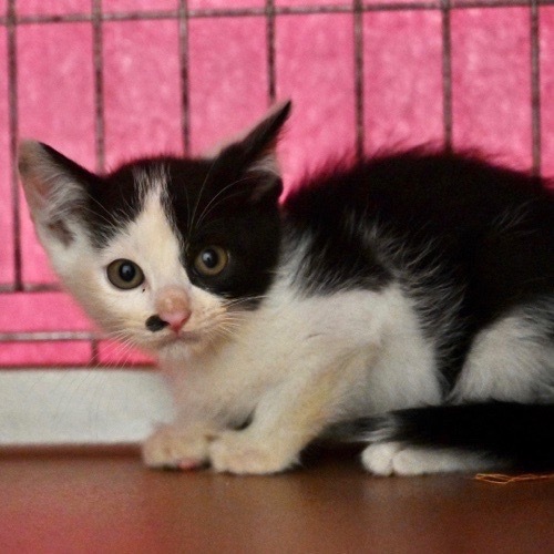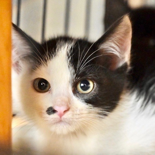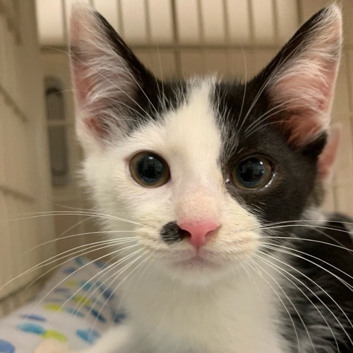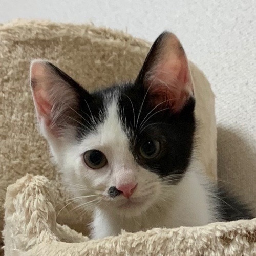 | 特徴(性格など) | 素敵ヘアスタイルで鼻の横にもワンポイントが! 保護してしばらくは控えめで恥ずかしがり屋さんでしたが、今では遊び大好きな元気な子に育ちました。 食欲旺盛でご飯タイムは野獣です(笑) まっく君と兄弟です。 ハチワレコンビ2匹でのお迎えも嬉しいです。 |