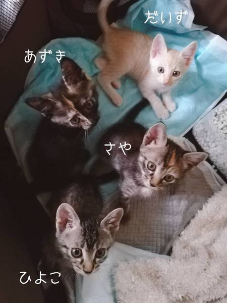 | 特徴(性格など) | 2020年8月7日現在で、みんな1キロ到達するところです。 だいず(クリーム色)♂ 威勢が良いです。 あずき(サビ)♀ 甘えん坊です。 さや(むぎわら)♀ 頭にさやえんどうの形みたいな茶色い毛があるのが特徴です。 ひよこ(むぎわら)♀ 小柄だけどお転婆です。 お届けは、千葉県我孫子市から車で一時間くらいまで(要相談)です。 子猫の様子は、ブログやインスタグラムに載せています。 ブログ https://ameblo.jp/abk-nekotomokai/ インスタグラム https://www.instagram.com/nekotomokai/?hl=ja 総じて、みんな元気いっぱいです。 兄妹で遊んだりくっついたりしているので、2匹セットで希望してくださる方を優先します。 |