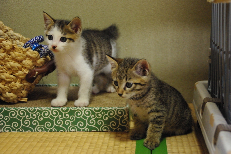 | 特徴(性格など) | どちらもとても活発で飛ぶように走り回っています キジ白のほうが食いしんぼでキジトラの分のオヤツを横取りしたり 2匹で仲良くじゃれあっています 余り人を怖がらず、初対面の人間が覗いても警戒しません 抱っこも平気です |