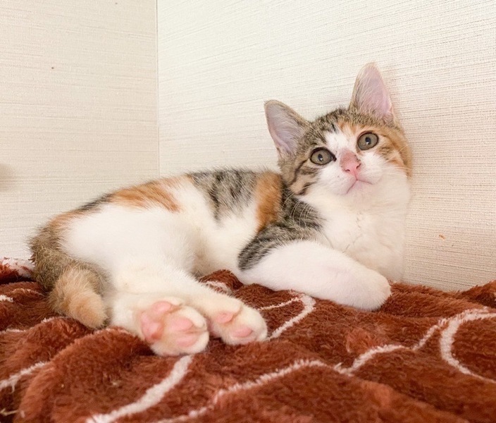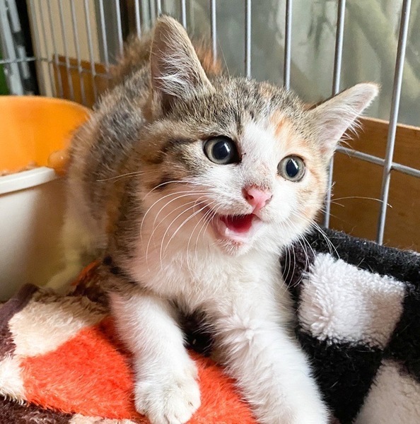 | 特徴(性格など) | もこもこ「パナップ」ちゃん♡ まだまだビビりだけど、好きな場所みつけて、あたちの場所♡なユニーク女のコ♪ じっくり時間をかけて頂ければ、きっと甘えっコになる予感♪ 現在、ドライフードを置き餌として、栄養補給のため、一日2回程度のパウチを与えています。 <推定誕生日:5月始め> |