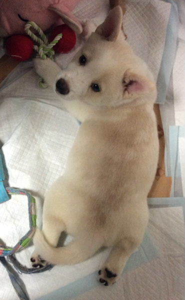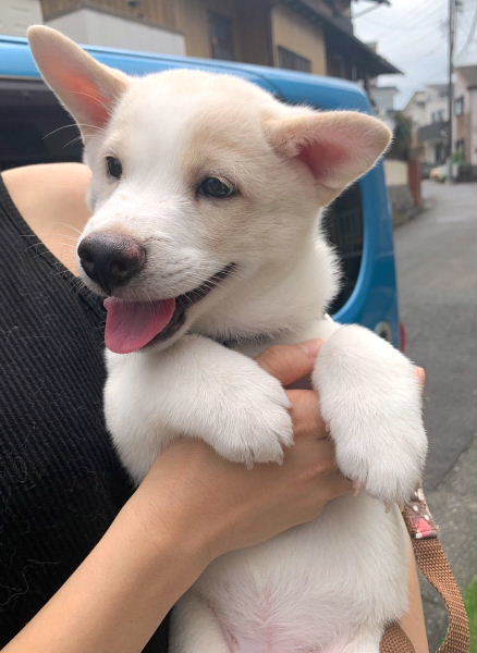 | 特徴(性格など) | MIX子犬の『ふうた』です。 (ちばわんHP掲載番号No.4077)←申込時は必ず犬の名前とこの番号を記載し、下記内容をよくお読みの上ちばわんHPからお願いします。 【毛色】白・薄茶 【体重】4kg(8/8現在) 【状態】ワクチン接種2回済、駆虫済、ノミ・ダニ駆除済、マイクロチップ装着予定、(8/27去勢手術予定) 【人馴】問題なし 【性格・その他】 アンバランスな体型がチャームポイント、天真爛漫な男の子です。 人が大好きで、犬にもとても友好的です。毎日、子犬らしくボールを追いかけて走り回ったり、おもちゃを鳴らして楽しく過ごしています。 お水の器に手を入れてバシャバシャ水で遊んだり、シートをビリビリ破るのもブームです。 排泄はケージの中ではシートにできますが、フリーではまだ勉強中で失敗もあります。 車酔いはいまのところなさそうですが、乗車中、大音量でずっと絶叫しています。 食欲は大変旺盛です。現在ふやかしたフードを1日3回食べています。 基本的な躾はこれからになります。 成長後は大きめの中型犬になると思われますが、予測ができませんのでサイズ制限のあるお宅には向いていません。「いくらでも大きくなあれ!」というご家族にお願いしたいと思います。 また、まだいたずら盛りの子犬であり、ふうたと向き合う時間をたくさん取って頂きたいため、ほぼお留守番のないご家庭を希望しています。 甘噛みがかなりありますので小さなお子さんがいらっしゃるご家庭には向いていません。 引き続き完全室内飼育で、定期的なワクチン接種やフィラリア予防などの健康管理、 脱走・逸走防止に対する室内外の厳重な注意と対策を必ずお約束いただける関東圏内 のご家庭で、天寿を全うするその日まで家族として大切にして頂ける方からのお問い合わせをお待ちしています。 トライアル開始は去勢手術後とさせていただきます。 尚、単身の方や同棲カップル、ご高齢の方のみのご家庭である場合はお断りさせて頂きますのでご了承ください。 【預かり場所】神奈川県横浜市 【預かり日記】 cherry.cookie.love (インスタグラム) https://www.instagram.com/cherry.cookie.love/ 君のためにできること http://cherry92.exblog.jp/ 【お申込み】 ちばわんの保護犬「ふうた」への申し込みはhttp://www.chibawan.net/contactform_dogからお願いします。 |