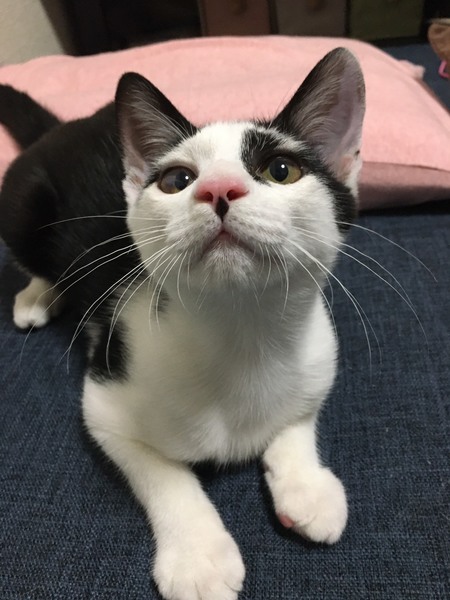 | 特徴(性格など) | 白と黒のブチ模様です。 鼻下にちょび髭のように見える柄が特徴的! めちゃくちゃ元気で人懐っこいです! |