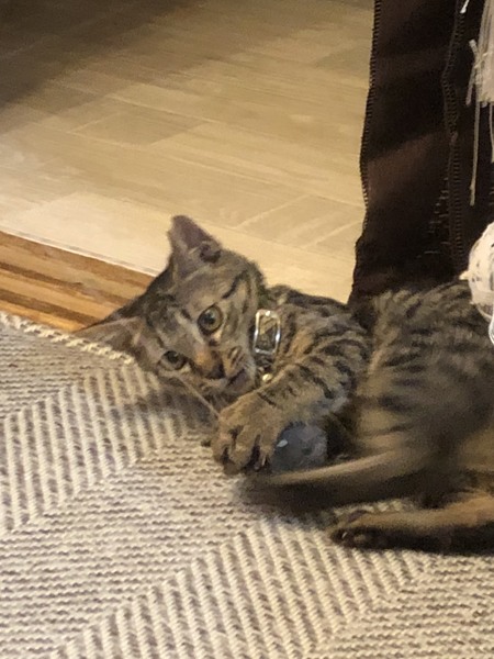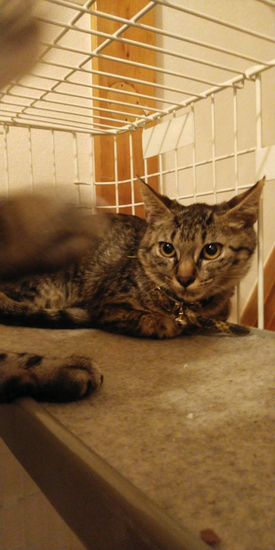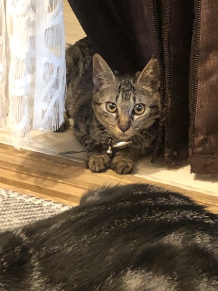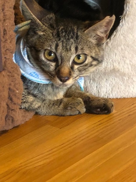 | 特徴(性格など) | 柄はキジトラです。性格はちょっとシャイですが、最近は先住猫とも仲良くなり、元気に遊んでいます。おとなしいので飼いやすいと思います。 写真が電灯のかげんで茶色ぽく写ってますが、毛色はもっと薄い色です。 |