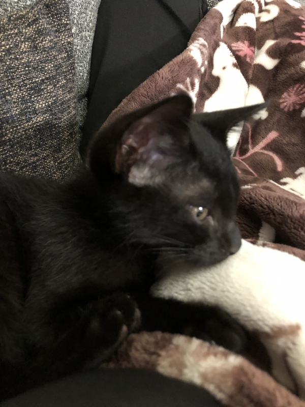| 特徴(性格など) | 真っ黒の鍵しっぽの子猫です とても好奇心旺盛で人懐っこい甘えん坊な子です 座ってたら必ず膝の上に乗ってきて グルグル言いながら顔を擦りつけてきてくれます。 そして家の中だと何処でもついて回る本当に甘えん坊な子です |