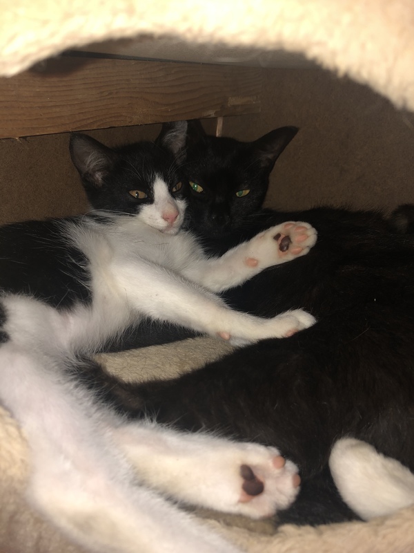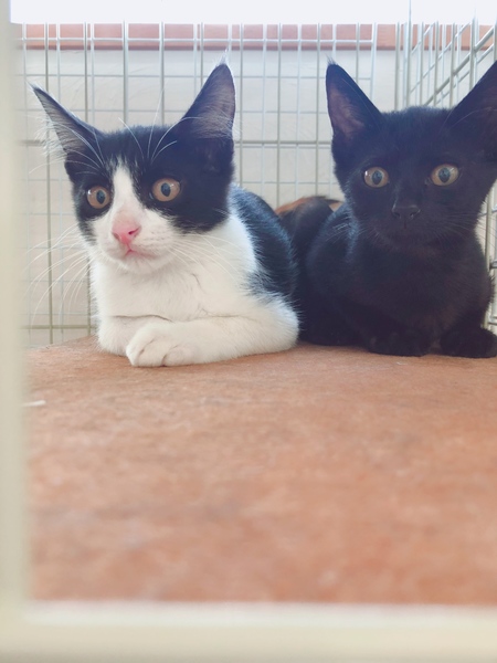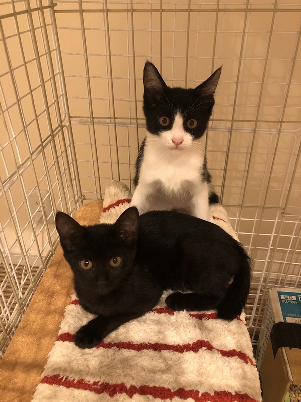 | 特徴(性格など) | ハチワレ(オス)びびりで母猫大好き甘えん坊。 黒(メス)母猫そっくり美人さん。マイペース。 |